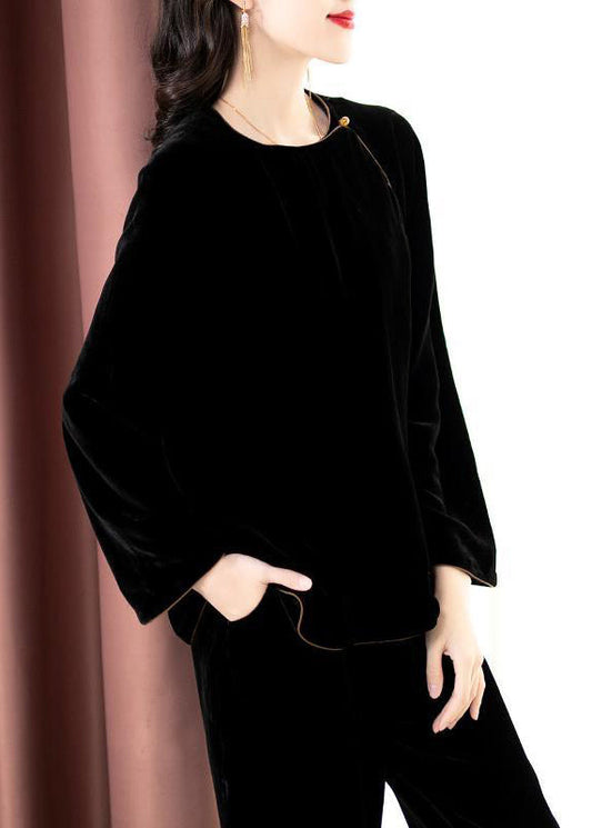 Loose Black O Neck Button Patchwork Velour Tops Fall LY9715