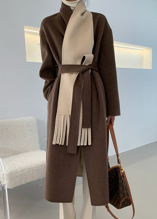 Loose Brown V Neck Tie Waist Double Sided Cashmere Long Coat Fall LY9809