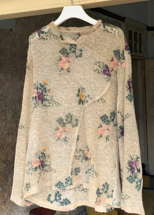 New Light Camel Asymmetrical Embroideried Thin Knit Tops Long Sleeve LY9808
