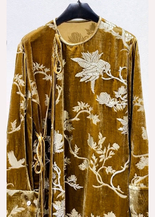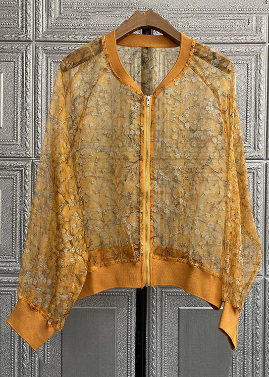 New Yellow Embroideried Zippered Patchwork Silk Thin Coats Long Sleeve LY9797
