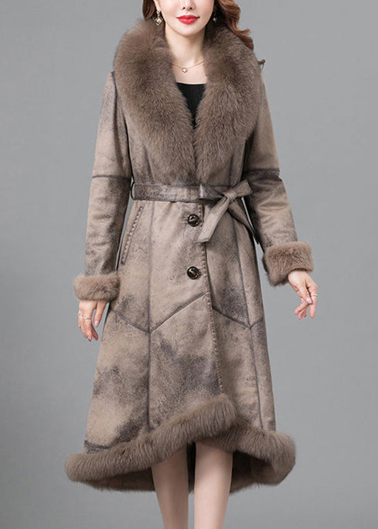 Beautiful Khaki Fox Collar Tie Waist Fuzzy Rabbit Leather And Fur Coats Winter LY9466