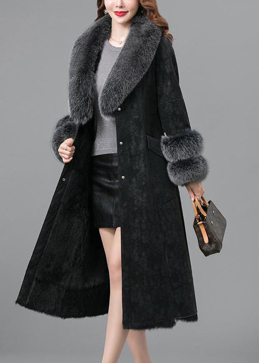 Black Warm Faux Rabbit Leather And Fur Coats Fox Collar Tie Waist Winter LY9385