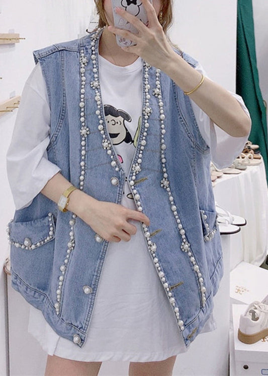 Cute Blue V Neck Patchwork Nail Bead Denim Waistcoat Fall LY9456