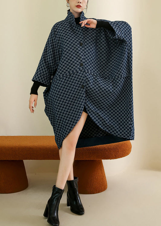 French Navy Plaid Button Patchwork Cotton Coat Batwing Sleeve LY9388