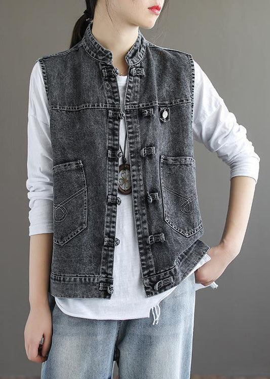 Natural Blue Stand Collar Pockets Patchwork Denim Waistcoat Sleeveless LY9464