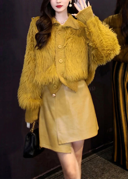New Yellow Button Patchwork Tops And Skirts Two Pieces Set Fall LY9390