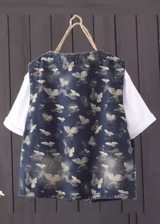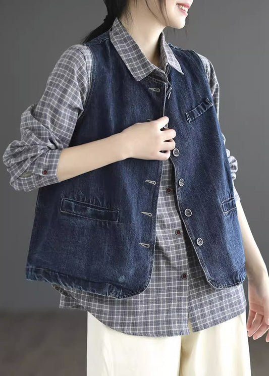 Vintage Dark Blue O-Neck Pockets Denim Waistcoat Sleeveless LY9460