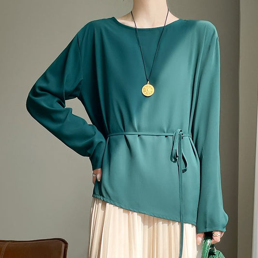Set: Long-Sleeve Round Neck Plain Asymmetrical Tee + String Belt