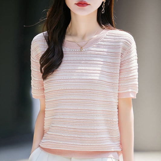 Short Sleeve Round Neck Striped Knit Top