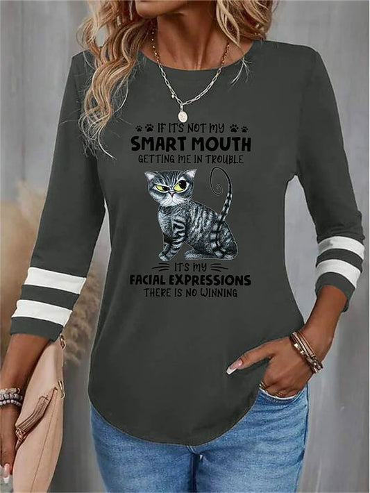 Women's T shirt Crew Neck Long Sleeve Tunic Cat Letter
