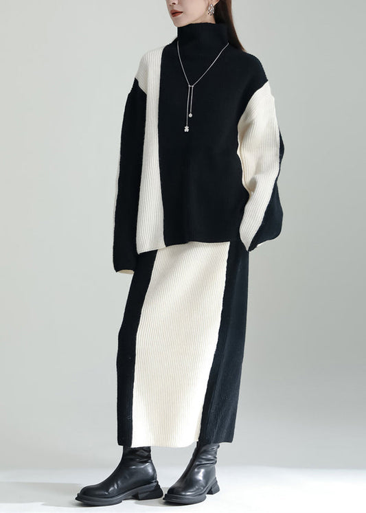 Black Patchwork Loose Knit Two Piece Suit Set Hign Neck Winter LY9483