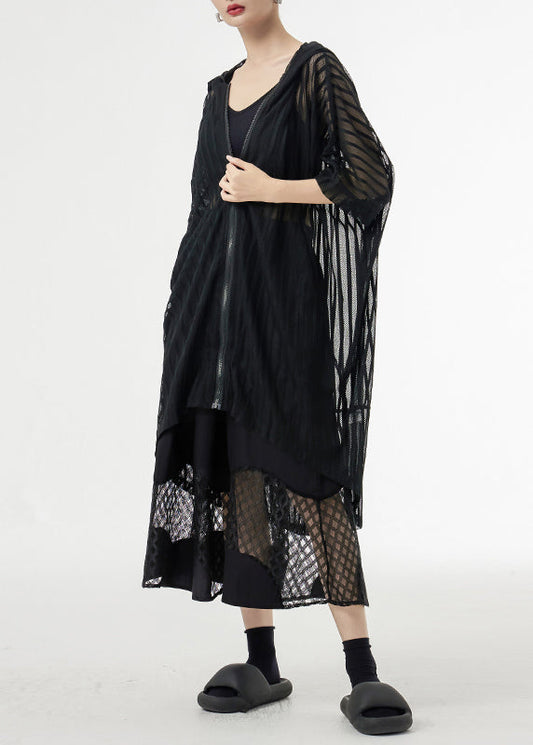 Black Zippered Pockets Patchwork Tulle UPF 50+ Coat Hooded Summer LY9563