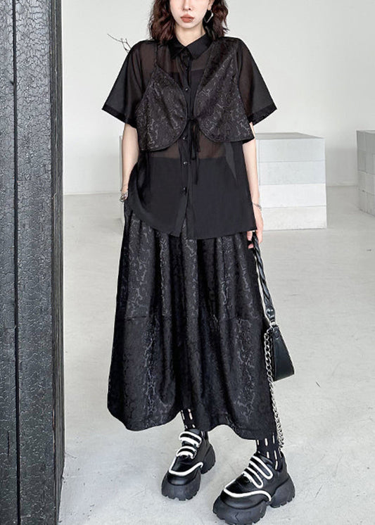 Elegant Black Jacquard Lace Up Patchwork Silk Cotton Two Piece Set Summer LY9560