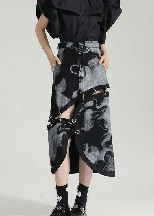 Fashion Grey Asymmetrical Print Pockets Patchwork Cotton Skirt Fall LY9471