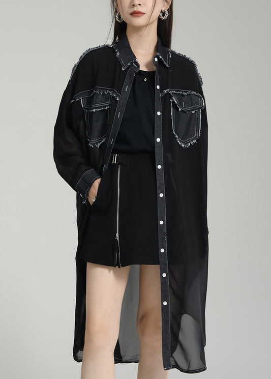 Unique Black Peter Pan Collar Pockets Patchwork Chiffon UPF 50+ Coats Summer LY9476