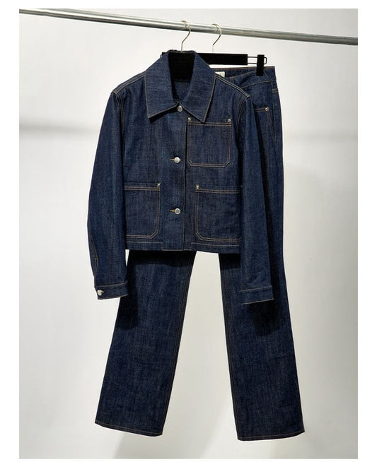 Long-Sleeve Contrast Stitching Denim Shacket / High Rise Straight Leg Jeans