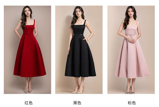 Sleeveless Square Neck Plain Midi A-Line Dress
