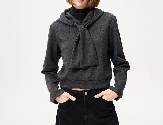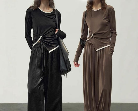Long-Sleeve Crew Neck Contrast Trim Ruched Asymmetrical Knit Top