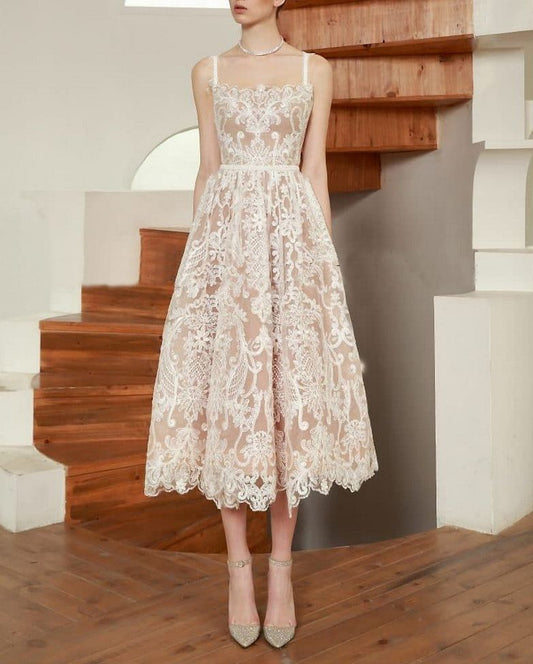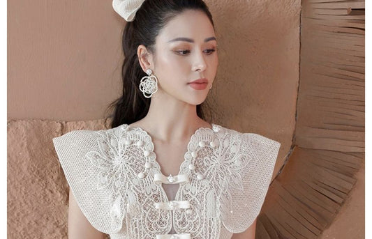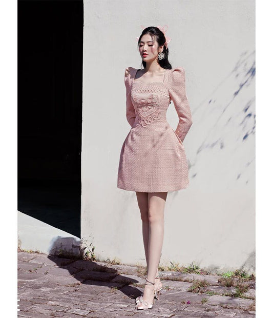 Long-Sleeve Sweetheart Neck Plain Embroidered Tweed Mini A-Line Dress