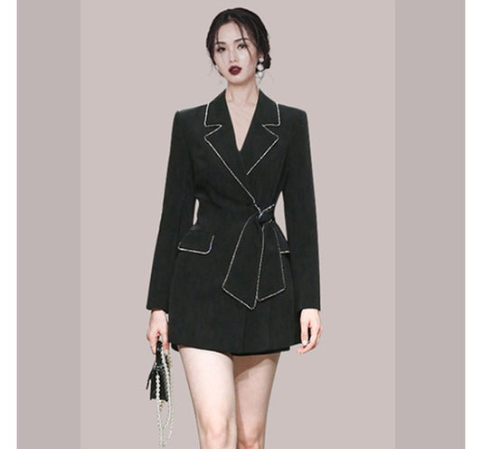 Long-Sleeve Notch Lapel Plain Rhinestone Accent Tie Front Mini A-Line Blazer Dress