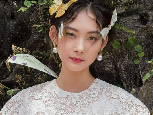 Long-Sleeve Band Collar Dotted Flower Accent Blouse / High Rise Pencil Skirt