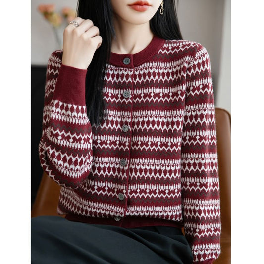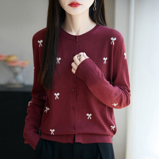 Elbow-Sleeve V-Neck Jacquard Contrast Trim Button-Up Cardigan