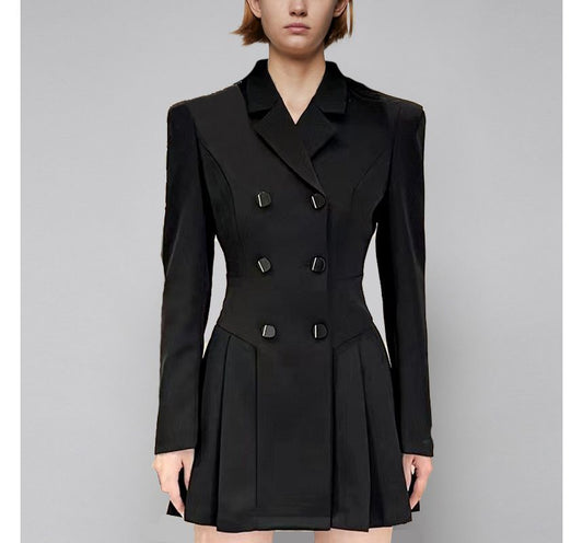 Long-Sleeve Notch Lapel Plain Pleated Double Breasted Mini A-Line Blazer Dress