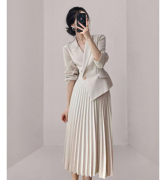 Long-Sleeve Notch Lapel Plain Asymmetrical Panel Accordion Pleated Midi A-Line Blazer Dress