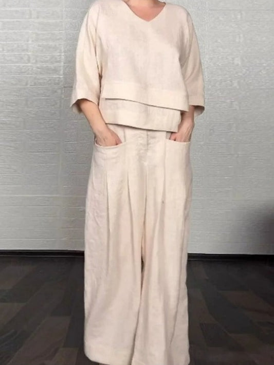 Women's Shirt Pants Sets Long Cotton Top Wide Leg Pants