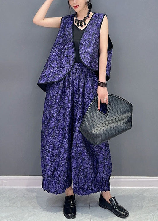 Vintage Purple Sleeveless Vest Tops And Pants Cotton Two Piece Set Women Clothing LC0354