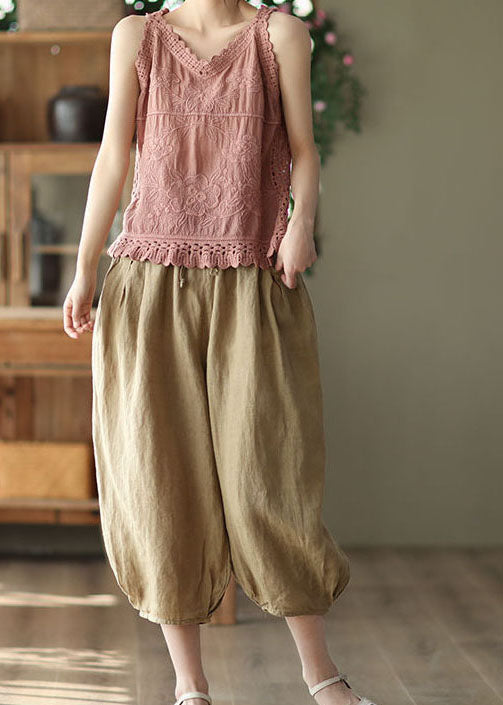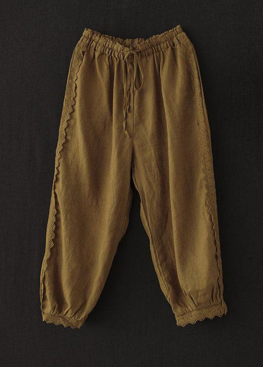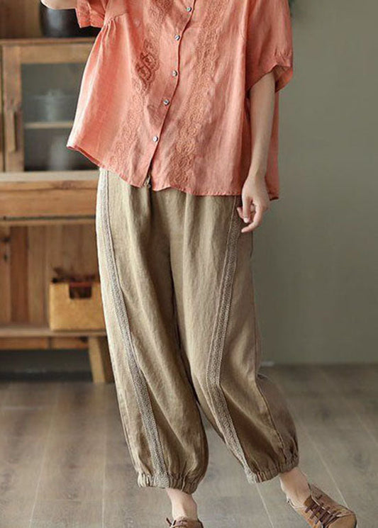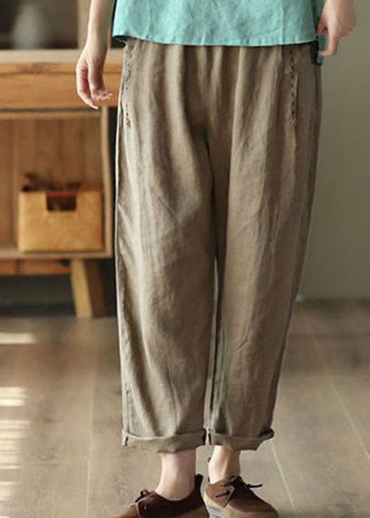 Khaki Hollow Out Patchwork Linen Harem Pants Summer LY0212