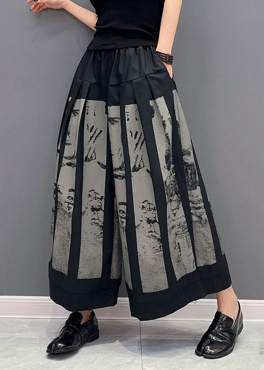 Style Black Elastic Waist Pockets Print Cotton Wide Leg Pants Spring LY0568