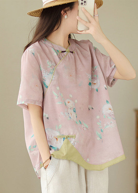 Chinese Style Orange Stand Collar Print Button Linen Shirts Short Sleeve LY2979