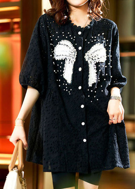 Italian Black Hollow Out Nail Bead Patchwork Cotton Shirt Top Summer LY3858