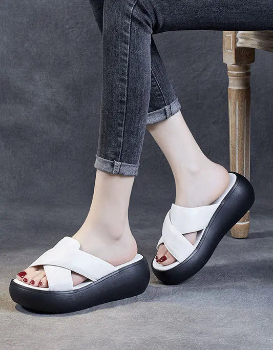 Brown Sandals Chunky Cowhide Leather Retro Splicing Buckle Strap