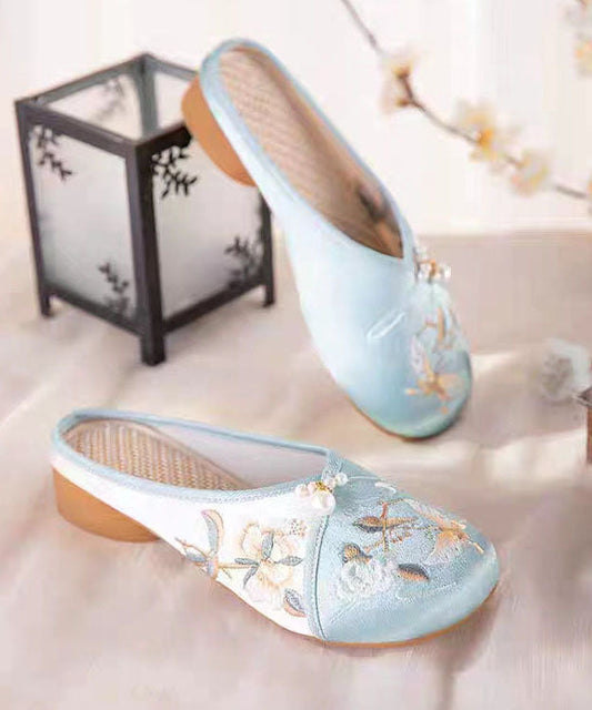 Retro Splicing Embroideried Flat Slide Sandals Light Green Cotton Fabric LY7686