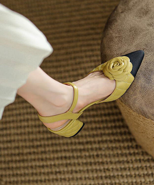 Boutique Buckle Strap Floral Splicing Chunky Sandals Yellow Cowhide Leather LY7615