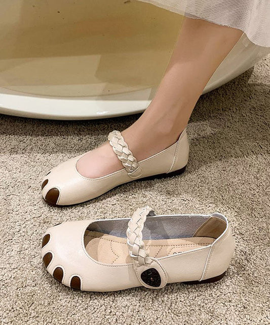 Fine Buckle Strap Flat Shoes For Women Beige Cowhide Leather LC0528