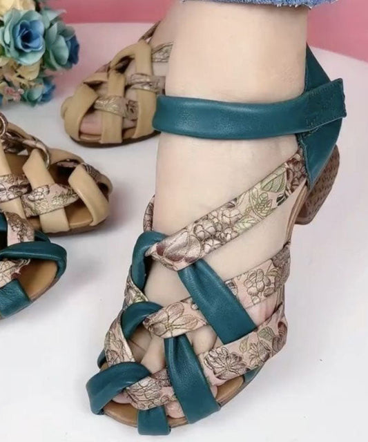 Vintage Hollow Out Splicing Chunky Sandals Green Genuine Leather Print FA262