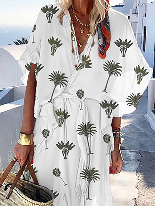 Women Casual Sundress Sexy V-neck Lantern Sleeve Floral Print Elegant Loose Bohemian Beach Dress WJ83