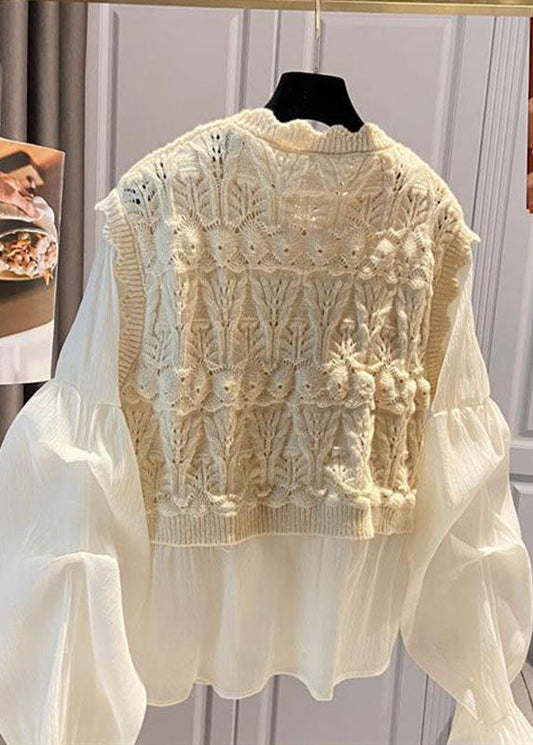 Boho Apricot O-Neck Lace Patchwork Hollow Out Shirts Long Sleeve FA264