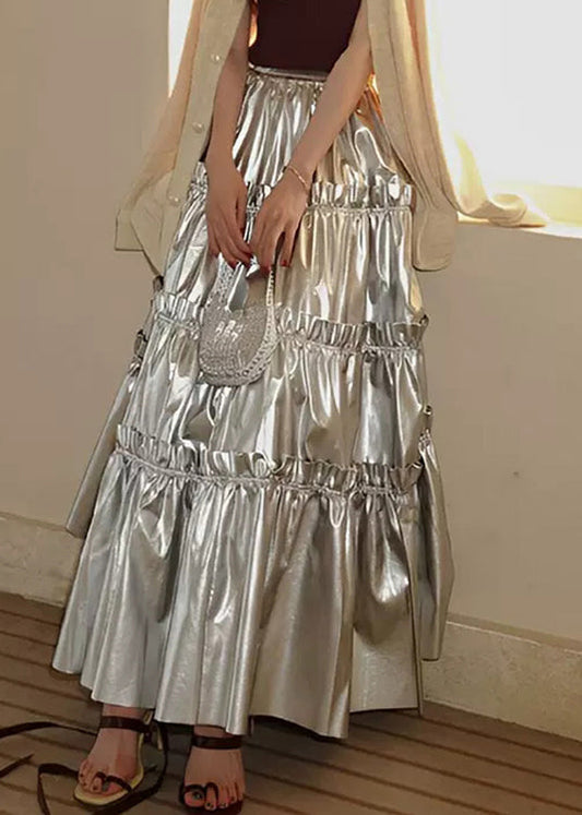 Italian Silver Ruffled Patchwork Elastic Waist Cake Skirt Summer FA308
