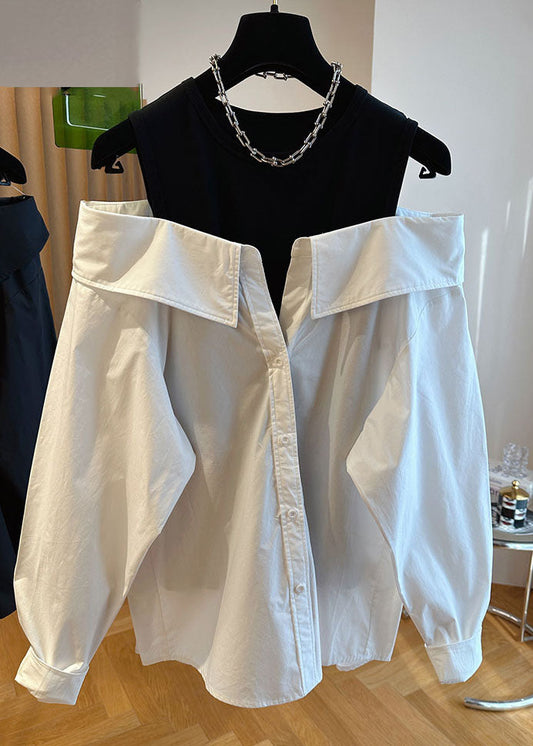 Style Black O-Neck Off Shoulder Patchwork Shirts Long Sleeve ML2214