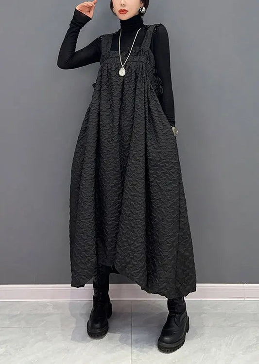 Casual Black Wrinkled Pockets Patchwork Cotton Carpenter Dresses Fall AH400