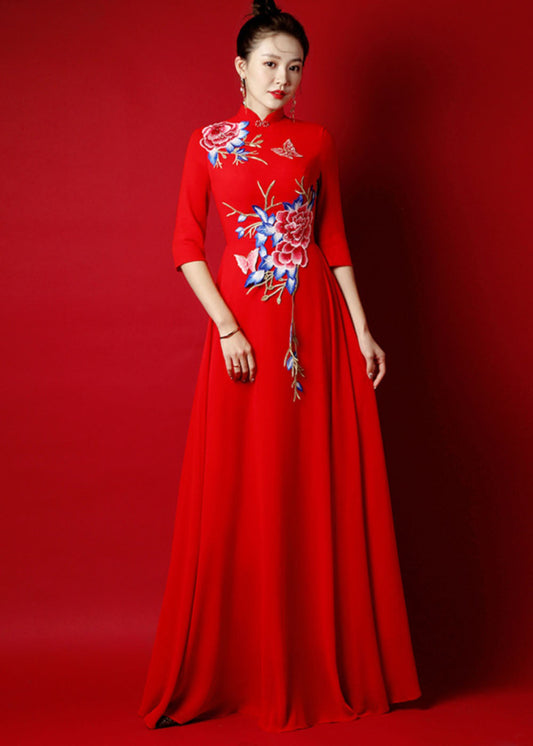 Elegant White Stand Collar Embroideried Chiffon Long Dress Bracelet Sleeve ML1583