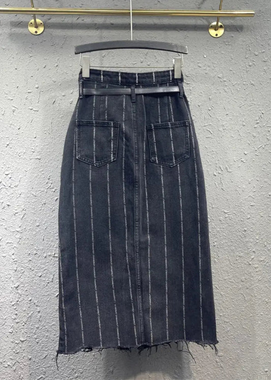 Italian Black Striped Front Open Pockets Patchwork Denim Skirt Fall ML0776