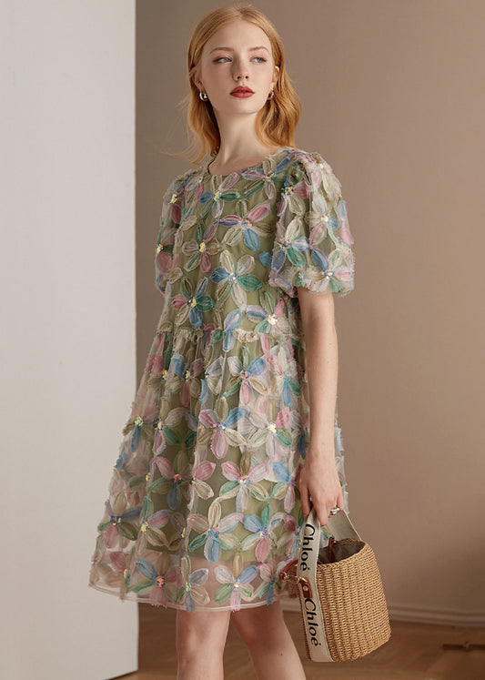 Italian Green O Neck Floral Patchwork Tulle Mid Dresses Puff Sleeve FA310