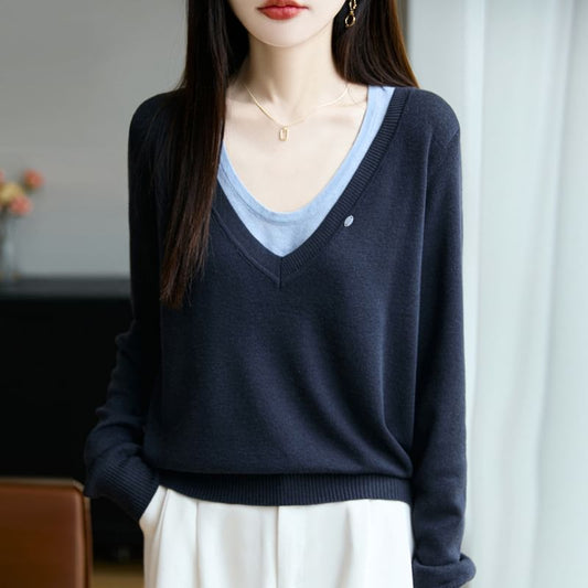 Mock Two-Piece Long-Sleeve V-Neck Two-Tone Sweater