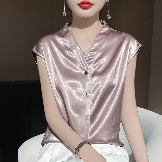 Cap-Sleeve V-Neck Button-Up Plain Satin Blouse