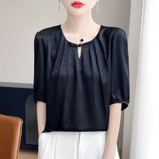 Elbow-Sleeve Crew Neck Plain Frog Buttoned Satin Blouse